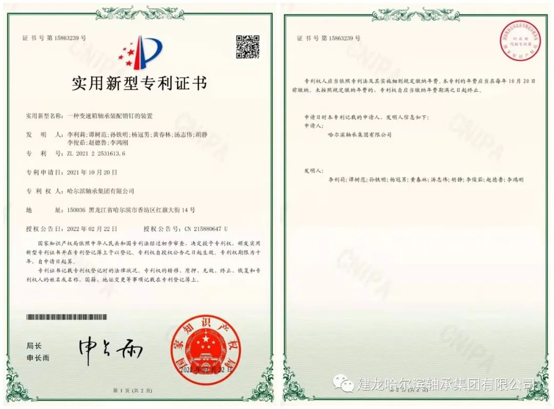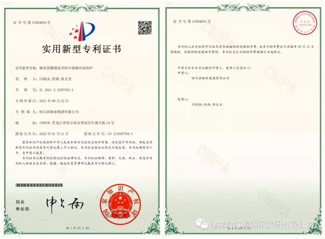 近日,建龍哈軸3項(xiàng)實(shí)用新型專利獲國(guó)家知識(shí)產(chǎn)權(quán)局授權(quán),本次批復(fù)的三項(xiàng)專利名稱分別為:軸承套圈鍛造用的中頻感應(yīng)加熱爐、一種變速箱軸承裝配銷釘?shù)难b置、一種高精度雙列圓柱滾子軸承無損裝配設(shè)備。
