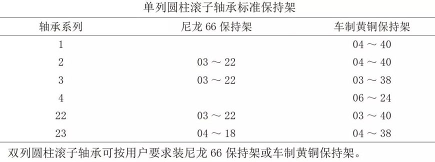 單列圓柱滾子軸承的標(biāo)準(zhǔn)保持架列于下表。NU、NJ、NF 及 NUP 型軸承之保持架通常與 N 型軸承相同。