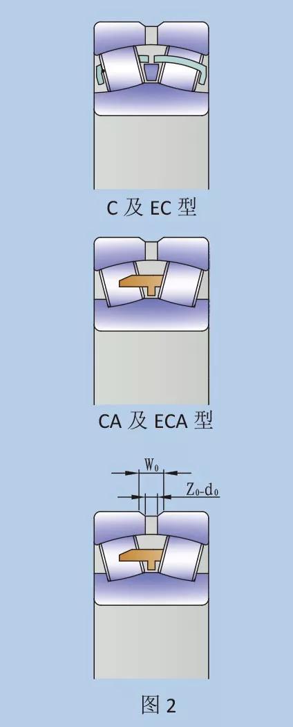 為了便于有效潤(rùn)滑,標(biāo)準(zhǔn)型 HRB 調(diào)心滾子軸承外圈帶有環(huán)狀油槽和三個(gè)油孔,但外徑小于 150mm 或 180mm(隨不同系列而定)之 C 型軸承及所有 213 系列軸承除外。后綴W33 用于表示 C、EC、CA 及 ECA 型軸承外圈帶有油槽及油孔。
